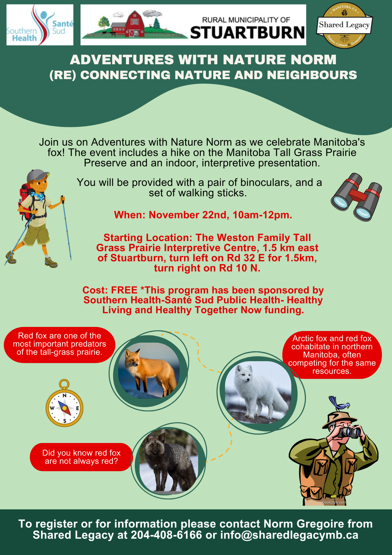 Join us on Adventures with Nature Norm as we celebrate Manitoba’s fox and learn about the Tall Grass Prairie. You will be provided a pair of binoculars and a set of walking sticks to use during the event (limited supplies). And it’s FREE!