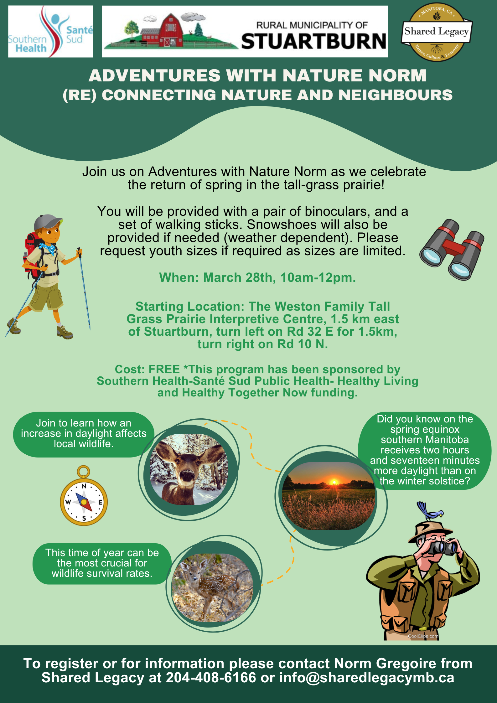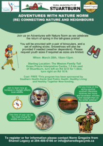 Join us on Adventures with Nature Norm as we celebrate the return of spring in the tall-grass prairie. You will be provided a pair of binoculars, a set of walking sticks and snowshoes (if necessary) to use during the event (limited supplies). Sizes of snowshoes are limited, so reserve yours early. And it’s all FREE!