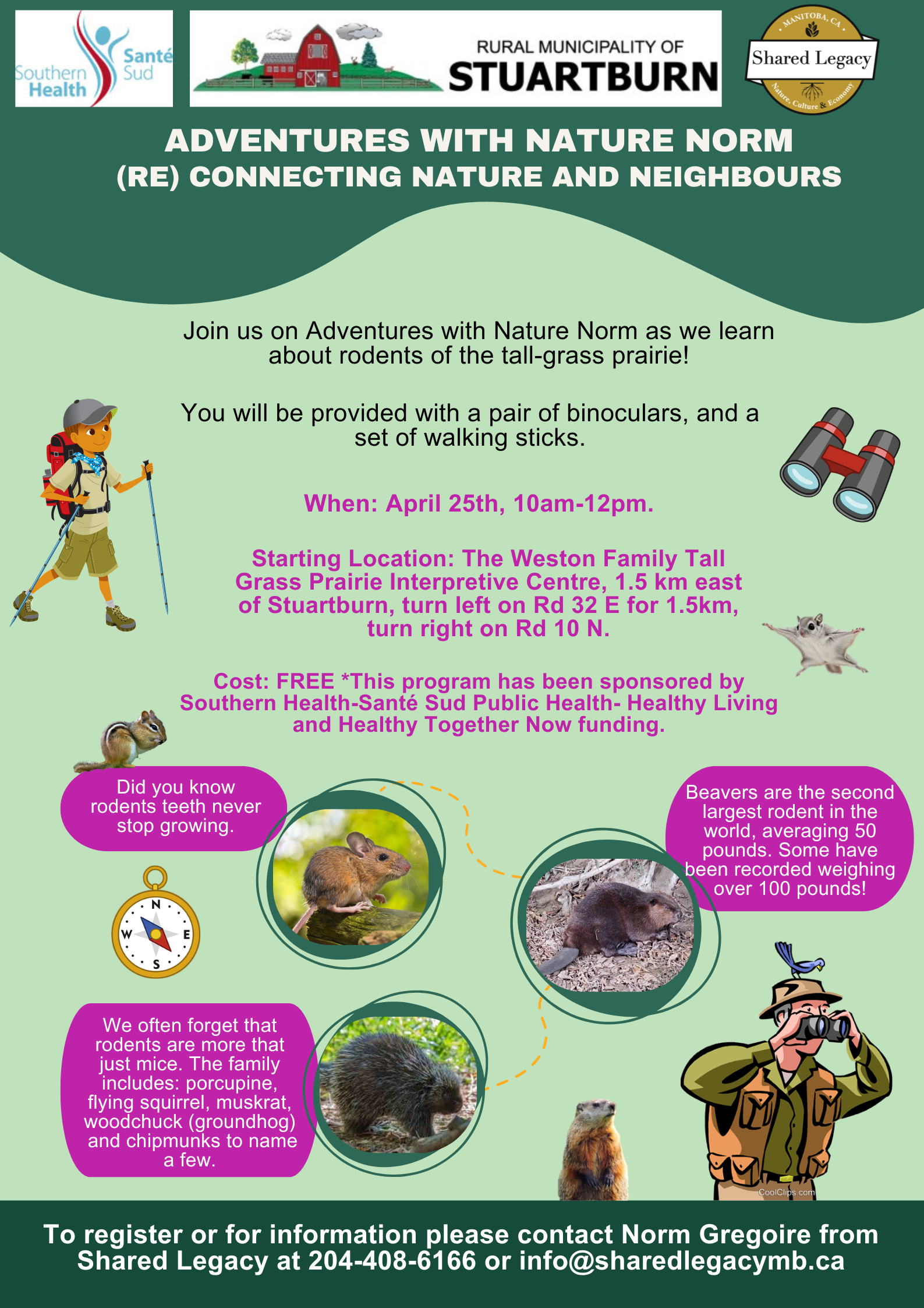 Join us on Adventures with Nature Norm as we learn about the rodents of the tall-grass prairie. You will be provided a pair of binoculars and a set of walking sticks to use during the event (limited supplies). And it’s all FREE!