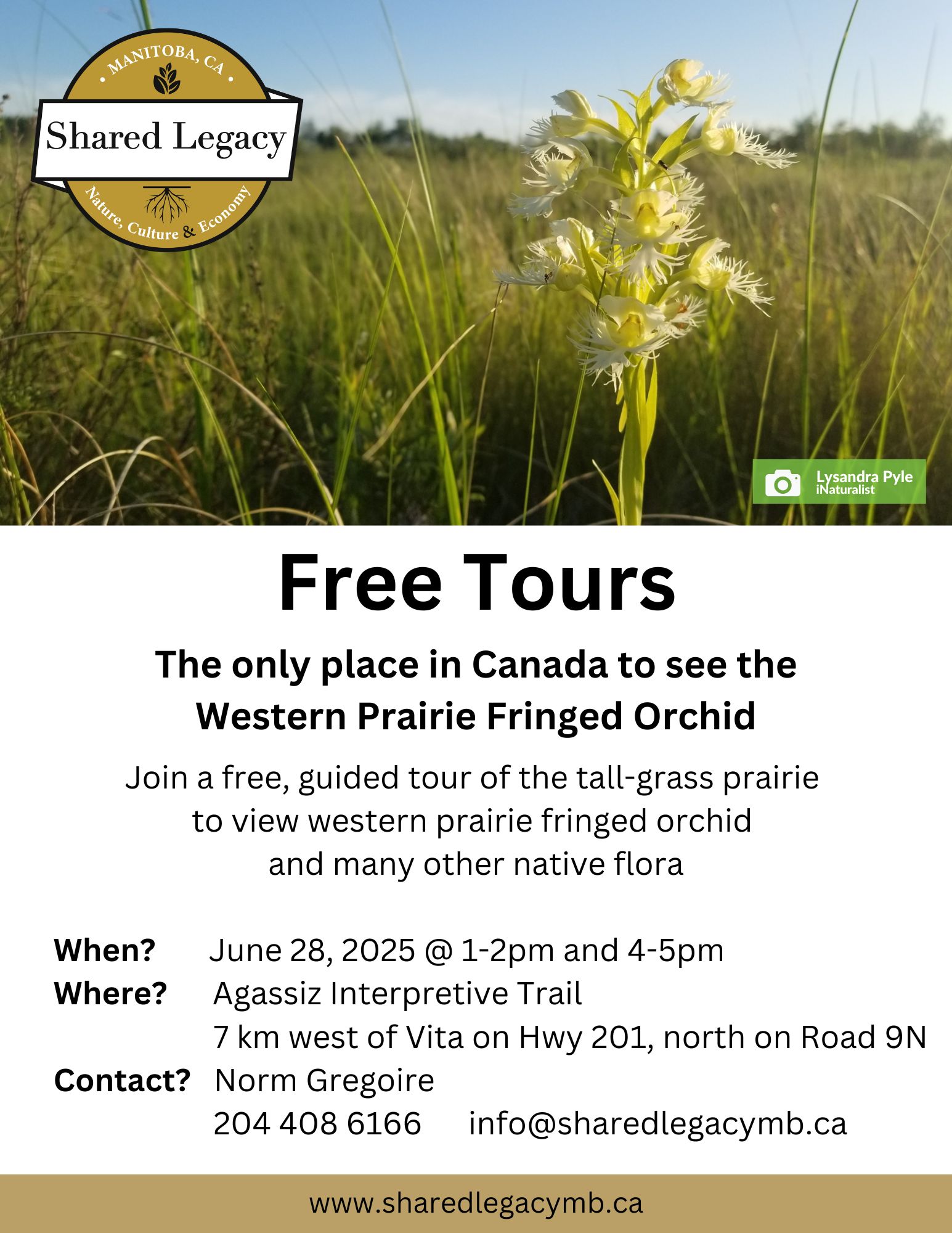 1 pm & 4 pm > Join one of our two free guided tours of the tall-grass prairie and marvel at the spectacular western prairie fringed orchid – the only place in Canada you can see them